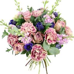 Immerse yourself in the beauty and uniqueness of this exquisite bouquet, featuring a harmonious blend of blue hydrangeas, light purple roses, green lisianthus, and white spray roses. Hand-selected for their freshness and vibrant colors, each flower is chosen to create a magical arrangement that leaves a lasting impression.